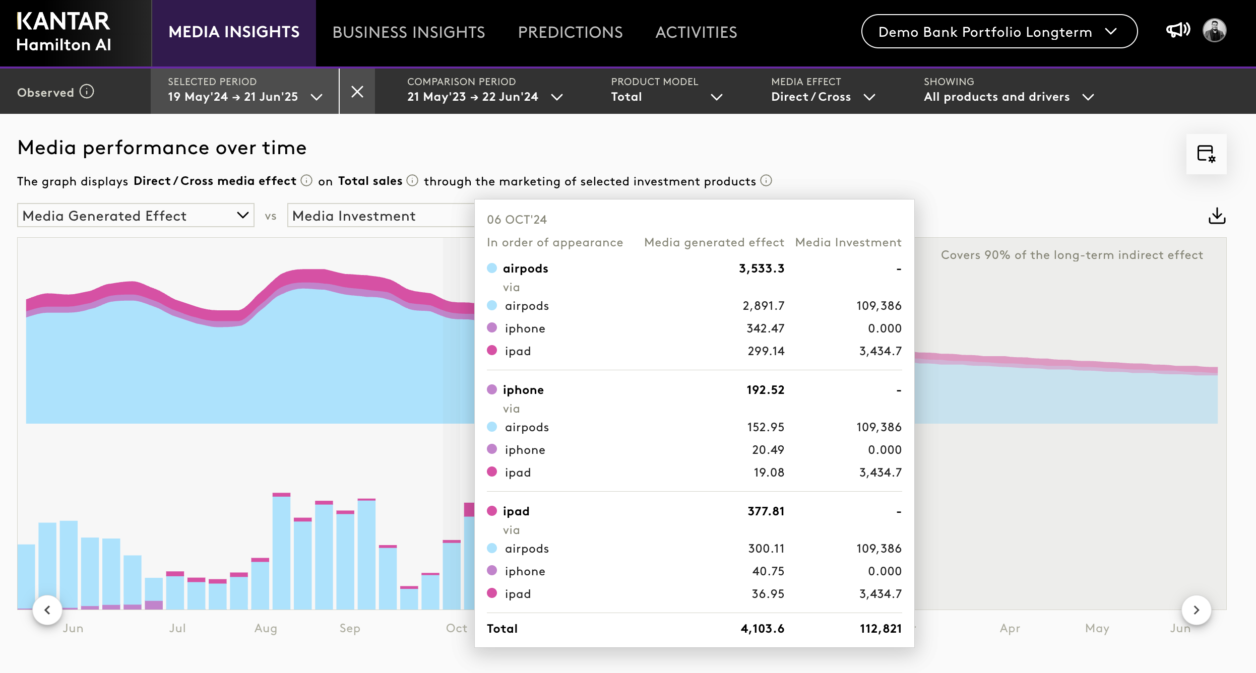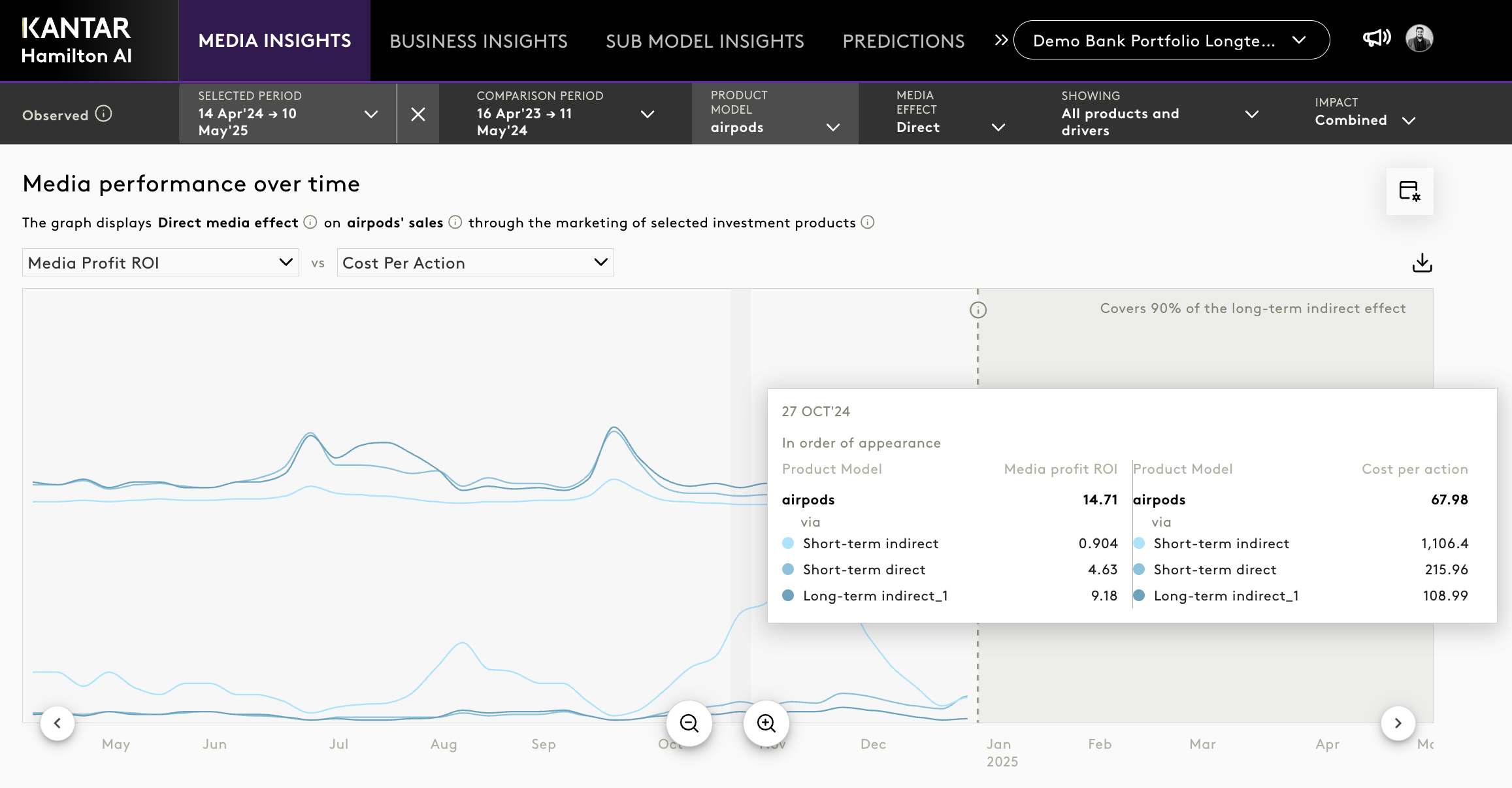 The Media Insights module in the Portfolio Long-Term Model allows users to explore how media investments influence product performance across both short- and long-term dimensions. It extends the capabilities of the standard Portfolio Model by introducing time-decayed visualisations, effect-type filtering, and grouped ROI attribution.