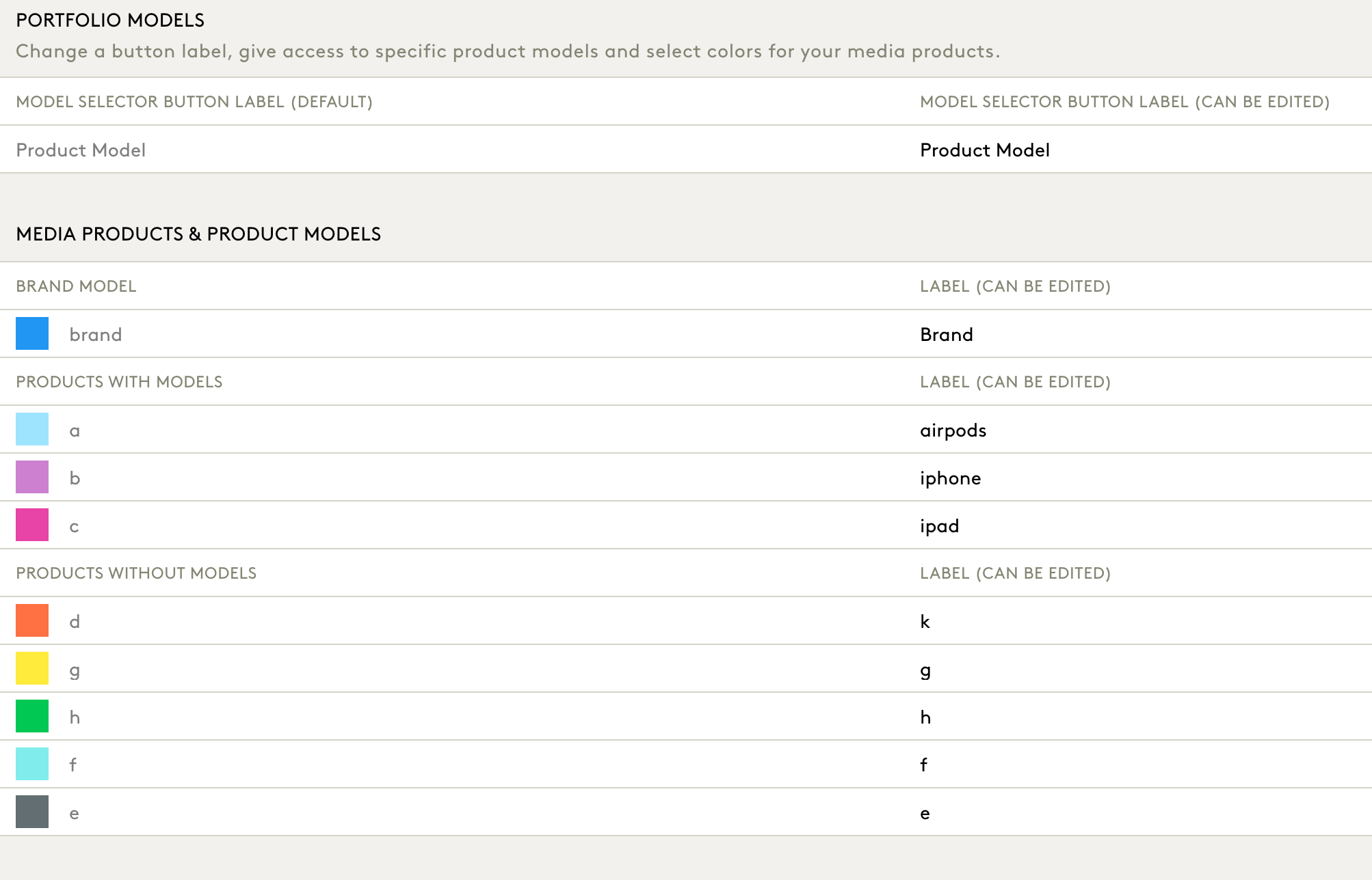 This section allows you to configure model selector button labels and set colours and labels for product variants.