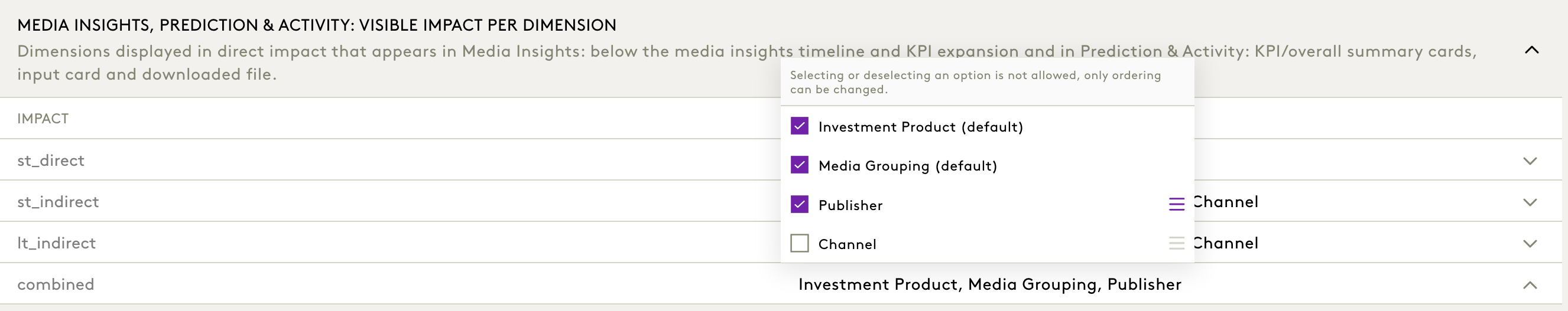 Defines which dimensions are used to break down media impact in the Media Insights, Prediction & Activities module.