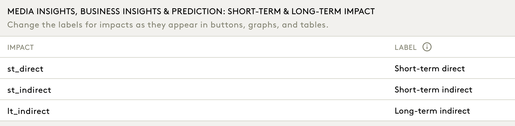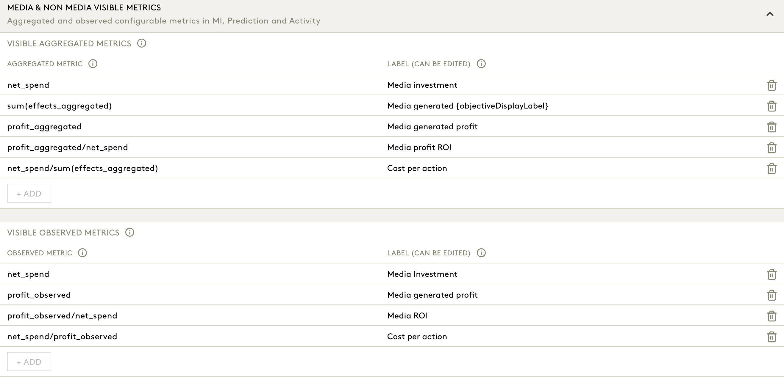 This controls which KPIs are displayed across Media Insights, Prediction, and Activity modules, and how they are labelled in the UI.