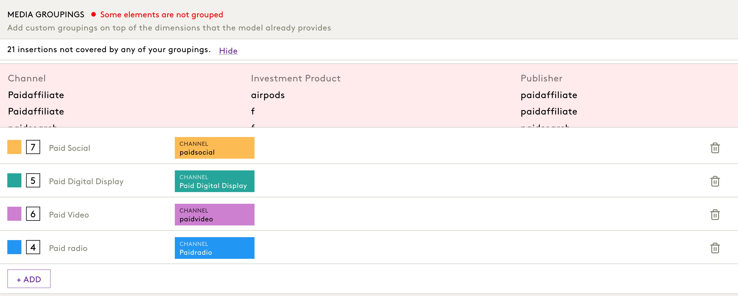 - Add a new grouping using the + ADD button at the bottom of the section.