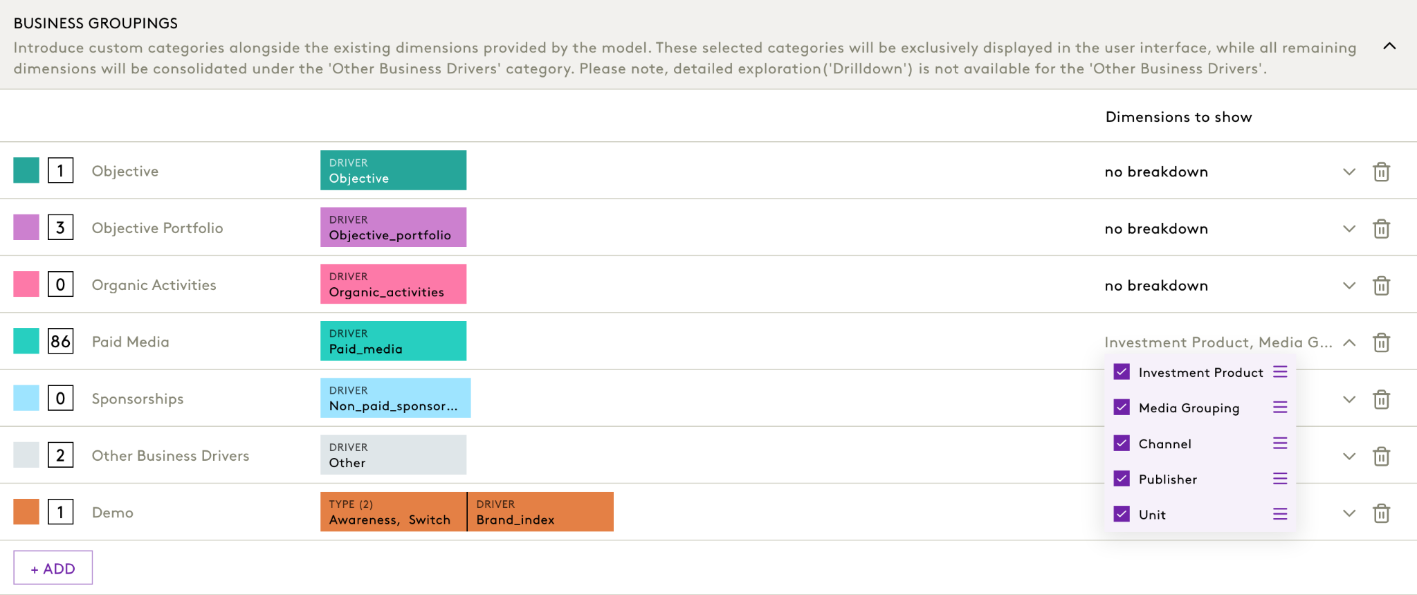 Grouped drivers will appear separately in platform outputs, while all other model drivers will be grouped under Other Business Drivers.