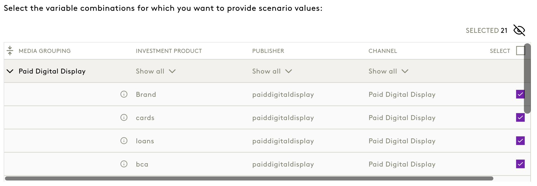 - Here, you can select the variable combinations for which you want to provide scenario values.