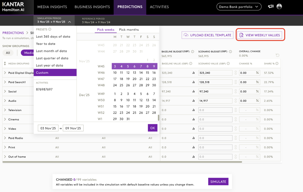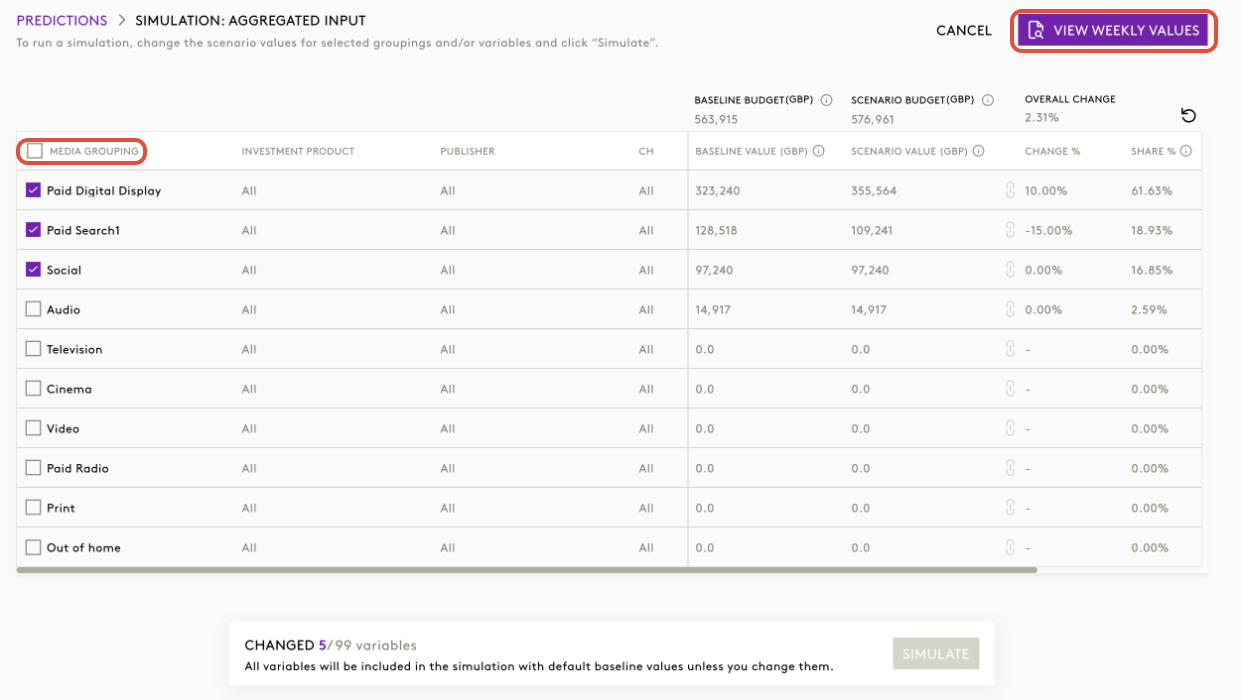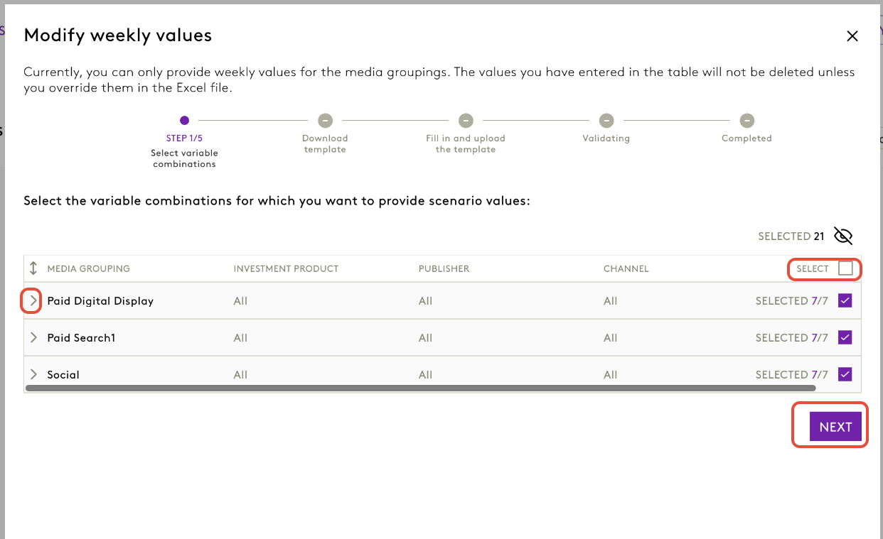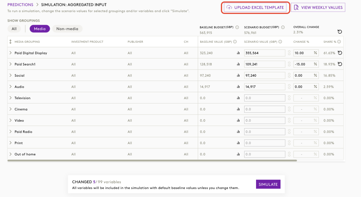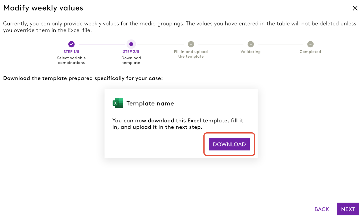 - You can upload input files using templates you’ve downloaded earlier, even before reaching the weekly values page.